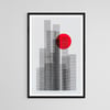 RED SUN CITY #2 is a generative artwork inspired by architecture and urban development. This artwork depicts several high-rise buildings only represented by interleaved vertical lines.